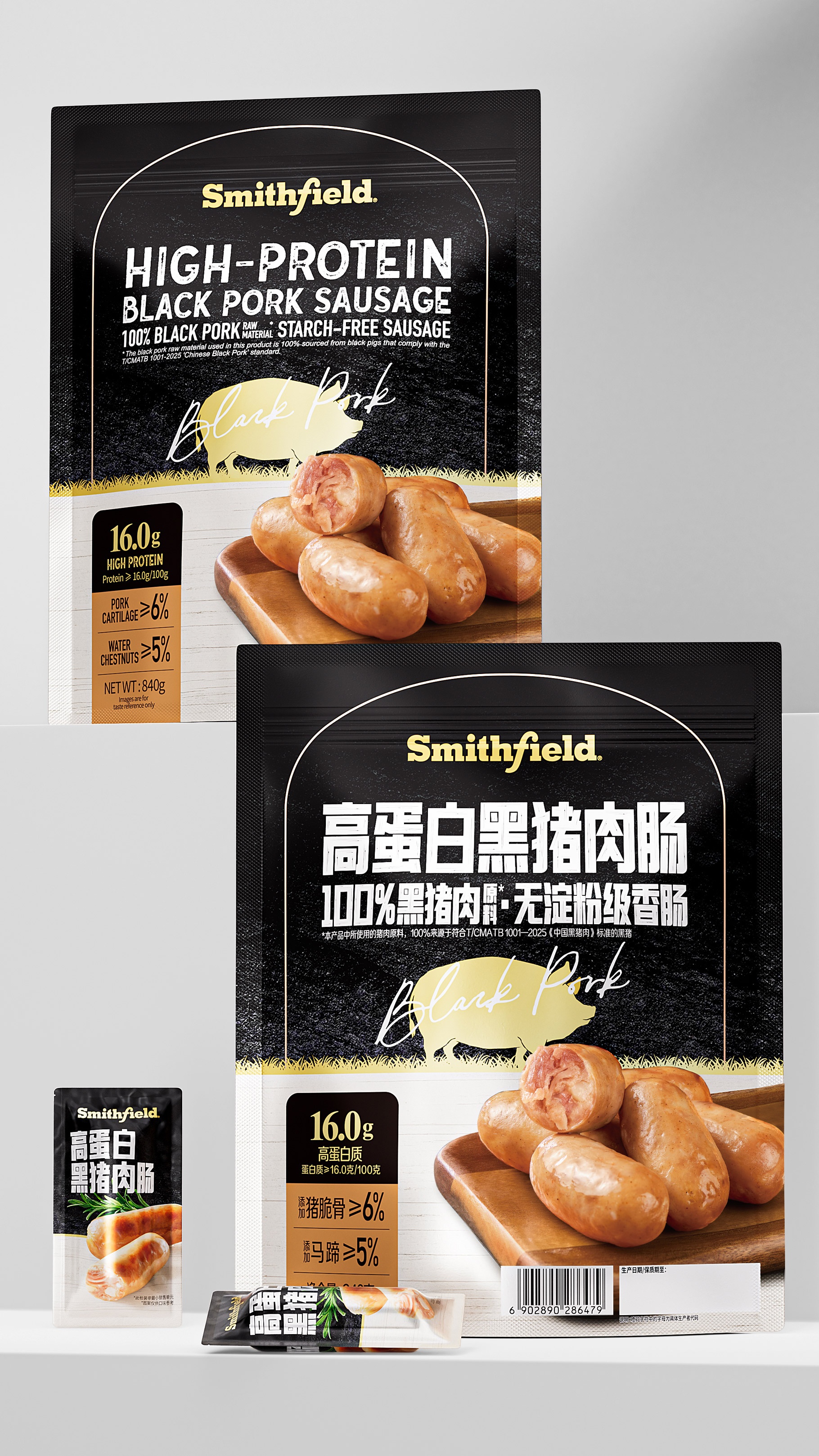 高端視覺語言?:黑色底色+金色元素(品牌名、豬形剪影)塑造質感,突出“黑豬肉”稀缺屬性;核心賣點(高蛋白、無淀粉)以醒目字體強化記憶。?